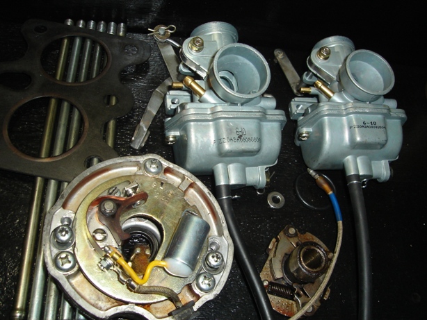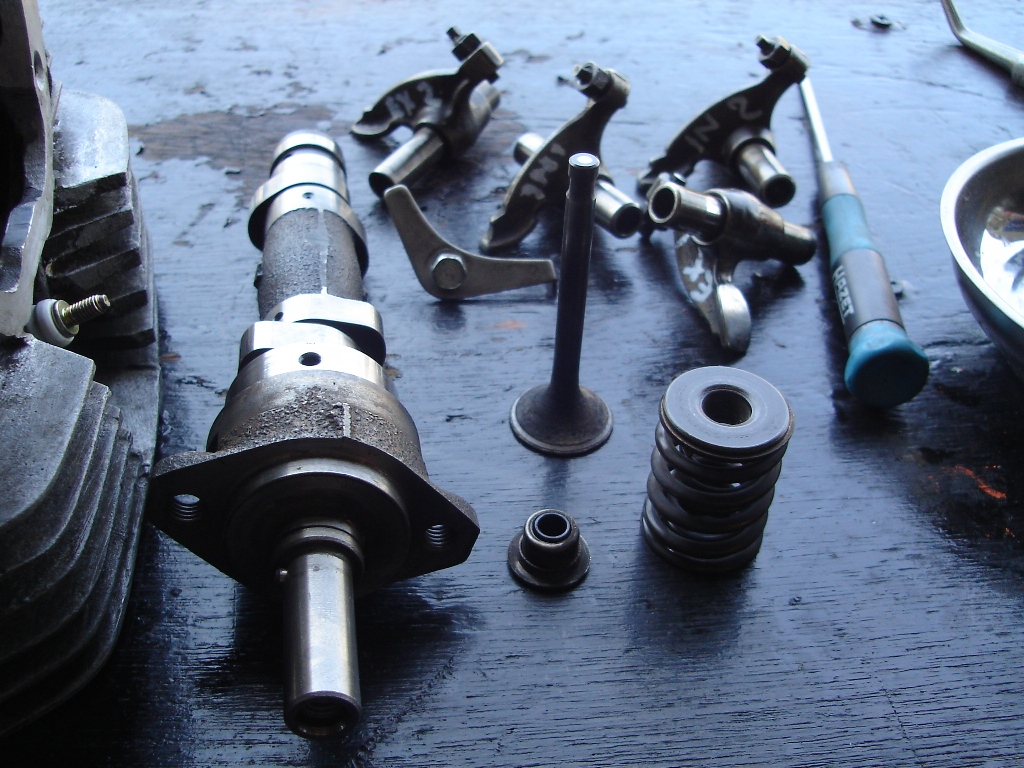 年式は1971年頃のものか。 マフラー等、所々新品パーツに交換しており、 前オーナーさんはかなり頑張った模様。 が、エンジンは不動なのでした。 入庫時バッテリーがあがっていて、バッテリー点火のこの車種はエンジンはかかるはずもないのです。 しかしバッテリーを新品交換しても初爆すらなく、火もどうも弱い。 で、コンデンサーの静電容量を調べるとパンクしている模様。 ポイントの接点も若干焼け気味なのでコンデンサーとコンタクトブレーカーの交換を行い、 ようやくエンジンが始動したが、アイドリングが安定しません」。 圧縮圧力は9弱・・・少し弱いが始動には問題ない数値。 プラグ交換、キャブもOHをしたがそれでもダメ。 ジェット類を新品交換してもダメなので、もうこれはキャブレター本体がダメになってるんじゃないでしょうか? というわけで純正の二連のPW18から、汎用のPC20へと変更。 二連のチョークステーはPW18に着いていたものをそのまま流用しました。 当初販売用に仕入れたのが、自分用の足に使ってもいいかなと思い、 ついでにエンジン腰上のOHもすることに。 で、とりあえずこんな感じです。 上はポイントベース、スパークアドバンサ、カムシャフト、ロッカーアームを取り外したヘッド。 で、シリンダー、ピストンは基準範囲内だったのでピストンリングのみを交換。 吸排気バルブ周りはスプリング、ステムシール(EX側しか着いていない)交換後、 シート修正、摺り合わせして完了。 クラッチ回りも、プレート、ディスク、スプリングの交換。 後は各ガスケットの到着を待ち、組み上げにかかるのみ。 続く・・・ 学生?の頃から日々葉巻とパイプを嗜んでまいりました。